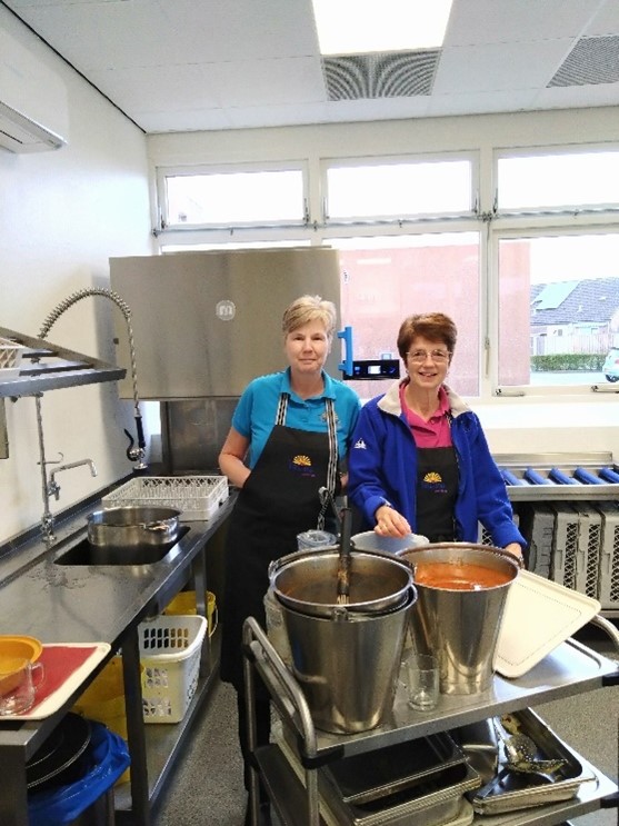 Jannet – “Op zondag hebben we minder afwas dan normaal. Dat scheelt een hoop werk. Als ik de keuken in kom, begin ik gelijk met afwassen. Vandaag wordt een gezellige werkdag want ik werk samen met Grietje. Rond 11:30 starten we met het wegbrengen van de maaltijden van Tafeltje Dekje, wij doen alles in de buurt van Talma Haven. De overige vier karren met zo’n 80 maaltijden worden opgehaald door onze geweldige vrijwilligers. Bij het rondbrengen van de maaltijden maken wij ook altijd een klein praatje met iedereen. Daarna komen de eerste koffertjes van de Tafeltje Dekje maaltijden van de vorige dag weer leeg de keuken binnen om afgewassen te worden. Niet altijd het leukste klusje. Vooral in de zomer kan er nog wel eens wat flora en fauna inzitten. Ondertussen komen de etenskarren de keuken in om schoon gemaakt te worden. Onze topper Age Koffeman heeft het restaurant inmiddels alweer leeggeruimd en brengt de afwas bij ons. We maken alles schoon en dweilen de vloer nog even na. Het einde van de werkdag is in zicht. Het is 14:00 uur als ik mijn jas pak en een bewoner me naroept “dag meid”, waar hoor je dat nog als je 57 bent.”